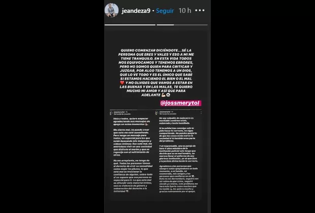 Asimismo, el futbolista Jean Deza no tardó en respaldar a Jossmery en este momento tan complicado.