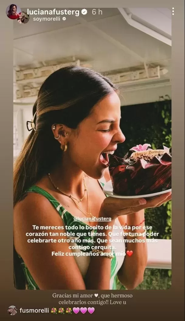A través de sus historias de Instagram, Morelli publicó una fotografía de Luciana mordiendo un pastel y acompañó esta imagen con unas conmovedoras palabras que expresan el gran amor que Juan siente por la modelo.