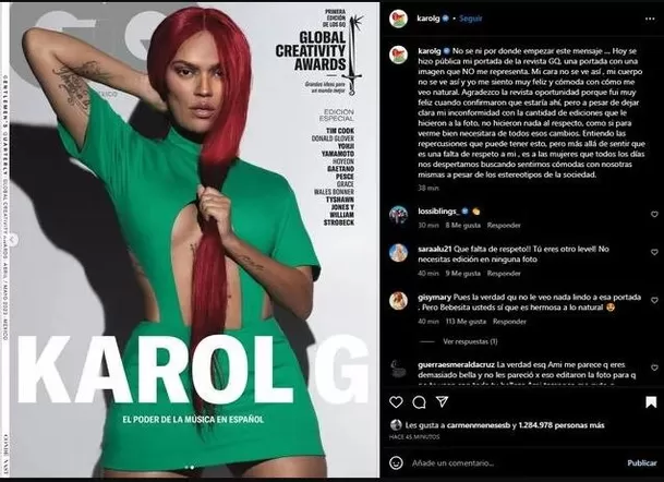 Recordemos que hace un mes, Karol G fue portada de la revista GQ, pero el resultado no fue el esperado y expresó su queja públicamente debido al excesivo retoque fotográfico que modificó por completo su apariencia. "Hoy se hizo pública mi portada de la revista GQ, una portada con una imagen que NO me representa. Mi cara no se ve así, mi cuerpo no se ve así, y yo me siento muy feliz y cómoda con cómo me veo: natural. Agradezco a la revista la oportunidad porque fui muy feliz cuando confirmaron que estaría ahí, pero, a pesar de dejar clara mi inconformidad con la cantidad de ediciones que le realizaron a la foto, no hicieron nada al respecto... Como si para verme bien necesitara de todos esos cambios. Entiendo las repercusiones que puede tener esto, pero más allá de sentir que es una falta de respeto hacia mí, es a las mujeres que todos los días nos despertamos buscando sentirnos cómodas con nosotras mismas a pesar de los estereotipos de la sociedad", escribió la popular Bichota en su Instagram en esa ocasión.