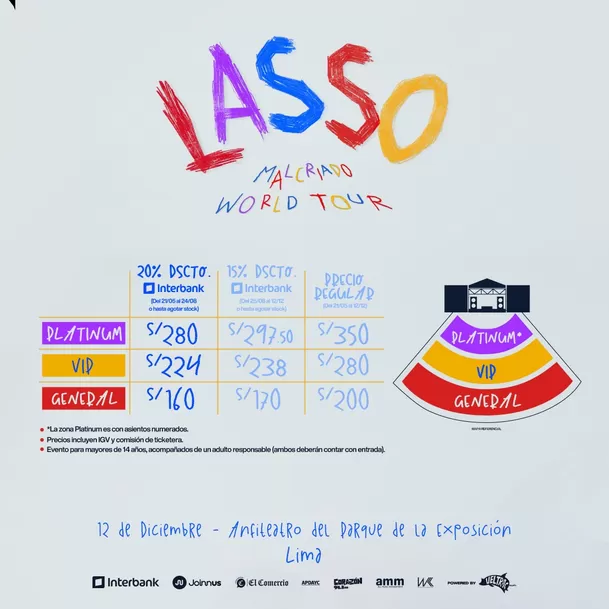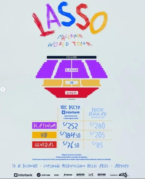 Las zonas y los precios full disponibles para el concierto de Lasso en Arequipa 2025 son los siguientes: