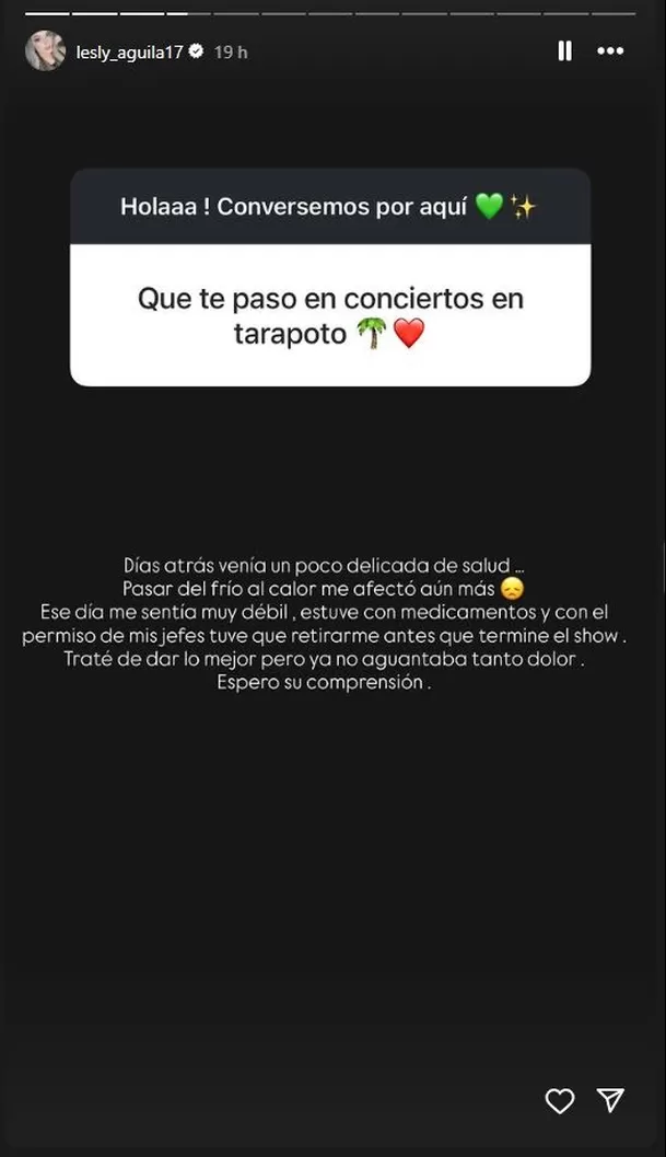 “Días atrás venía un poco delicada de salud. Pasar del frío al calor me afectó aún más”, escribió Lesly en una historia. En su mensaje, explicó que esa noche no se encontraba bien y que tuvo que medicarse antes de salir al escenario.