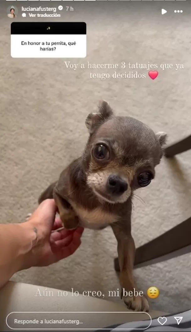 “En honor a tu perrita, ¿qué harías?”, consultó una usuaria, por lo que Fuster aseguró: “Voy a hacerme 3 tatuajes que ya tengo decididos. Aún no lo creo, mi bebé”.