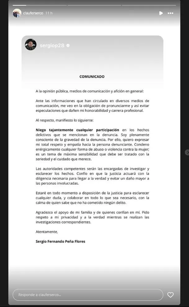 Sergio Peña, por su parte, finalizó su comunicado pidiendo respeto por su entorno familiar mientras el proceso sigue su curso. El caso continúa generando reacciones tanto en medios deportivos como entre seguidores del fútbol peruano.