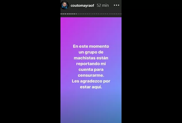 “Un grupo de machistas han reportado mi cuenta en Instagram para censurarme. Les agradezco por estar aquí”, escribió Mayra en la popular red social.