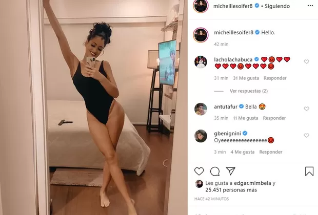 “Hello”, fue el breve mensaje que dejó Michelle como descripción de la foto en la que aparece en ropa de baño negra y en su habitación.