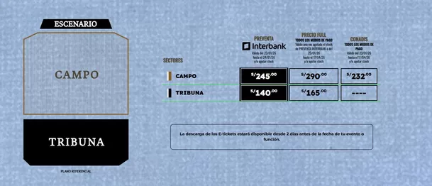 Asimismo, se aplicará un descuento Conadis para el sector Campo con un precio de S/ 232, válido del 23 de enero al 17 de abril de 2026 o hasta agotar stock, exclusivo para personas inscritas en Conadis. La descarga de los e-tickets estará disponible desde dos días antes de la fecha del evento.