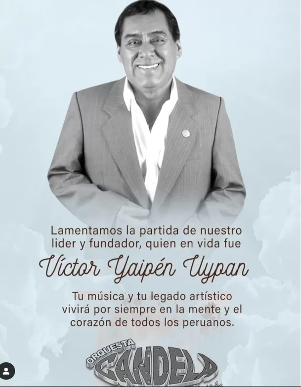 “Lamentamos profundamente el sensible fallecimiento de Víctor Yaipén Uypán, fundador de la Orquesta Candela, quien contribuyó con su talento al desarrollo de la cumbia peruana. Extendemos nuestras condolencias a sus familiares, amigos y seguidores en este difícil momento”, señaló la institución.