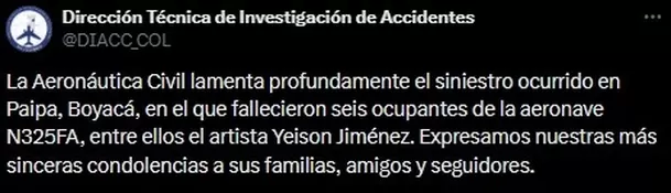 "La Aeronáutica Civil lamenta profundamente esta tragedia y expresa sus más sinceras condolencias a los familiares, amigos y seguidores del señor Yeison Jiménez, así como a las familias de los demás ocupantes y la tripulación", señaló la entidad en un comunicado en sus redes sociales.