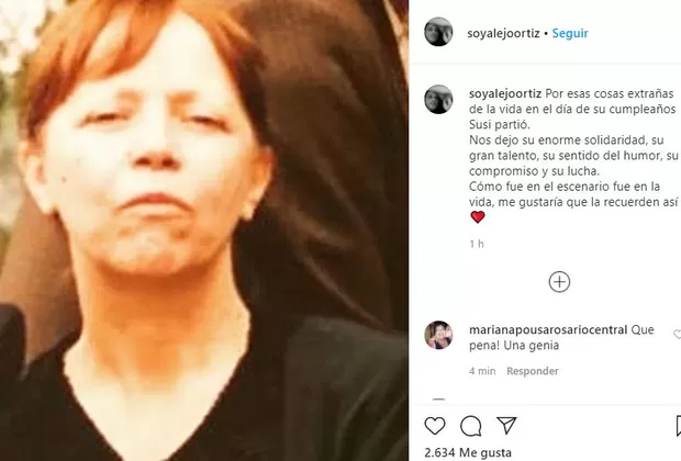 “Por esas cosas extrañas de la vida en el día de su cumpleaños Susi partió. Nos dejó su enorme solidaridad, su gran talento, su sentido del humor, su compromiso y su lucha. Cómo fue en el escenario fue en la vida, me gustaría que la recuerden así”, escribió el hijo de la reconocida actriz.