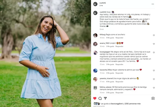 “¡Hola! Aquí estoy, lista para retomar mi vida, mis planes, mi trabajo y sobre todo las riendas de mi familia. Dicen que lo que no te mata te hace más fuerte y es verdad. Solo tengo palabras de agradecimiento para todos... La Vida continúa y comienza a gustarme esta nueva etapa. Gracias”, escribió Rosa en la red social.