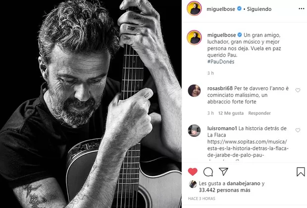 El cantante Miguel Bosé hizo lo propio: “Un gran amigo, luchador, gran músico y mejor persona nos deja. Vuela en paz querido Pau. #PauDonés”.