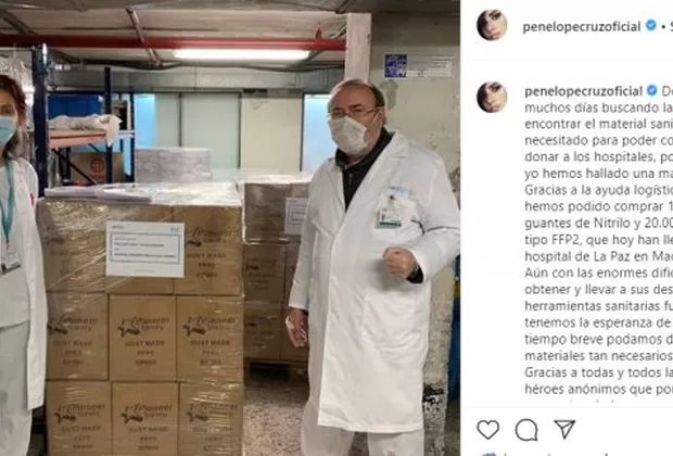 Los actores españoles Penélope Cruz y Javier Bardem han donado 100 mil guantes y 20 mil mascarillas al hospital La Paz de Madrid, con la ayuda logística del grupo Inditex, según ha anunciado la actriz a través de su cuenta de Instagram.