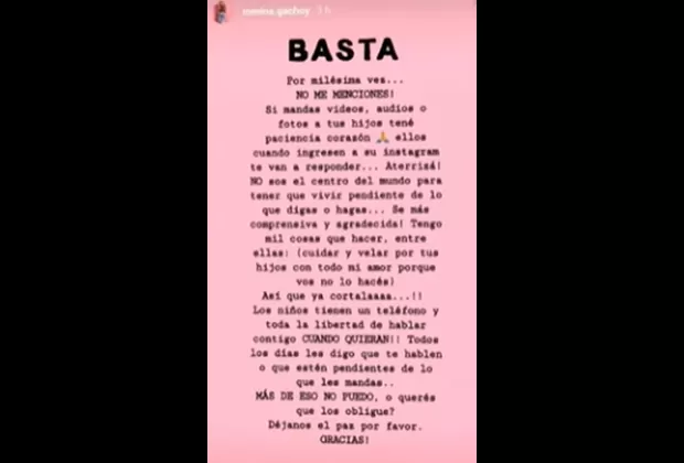 “BASTA. Por milésima vez… ¡NO ME MENCIONES! Si mandas videos, audios o fotos a tus hijos tené paciencia corazón, ellos cuando ingresen a su Instagram te van a responder… ¡Aterrizá!”, posteó Romina.