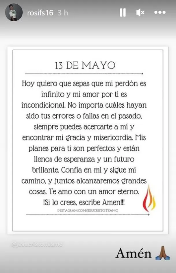 “Hoy quiero que sepas que mi perdón es infinito y mi amor por ti es incondicional. No importa cuáles hayan sido tus errores o fallas en el pasado, siempre puedes acercarte a mí y encontrar mi gracia y misericordia”, se lee en la primera parte del mensaje.