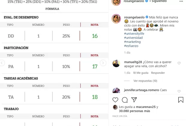 En Instagram, Rous publicó un sexy baile para celebrar que terminó el noveno ciclo con buenas notas y escribió: "Más feliz que nunca. Les cuento que aprobé el noveno ciclo con éxito. Miren mis notas. A celebrar".