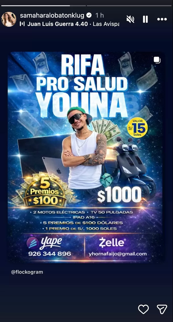 Samahara Lobatón no agregó ningún mensaje adicional, pero decidió repostear íntegramente la publicación de Youna. En la imagen se aprecia el anuncio de la rifa, el valor de cada número y los premios que se sortearán entre los participantes.