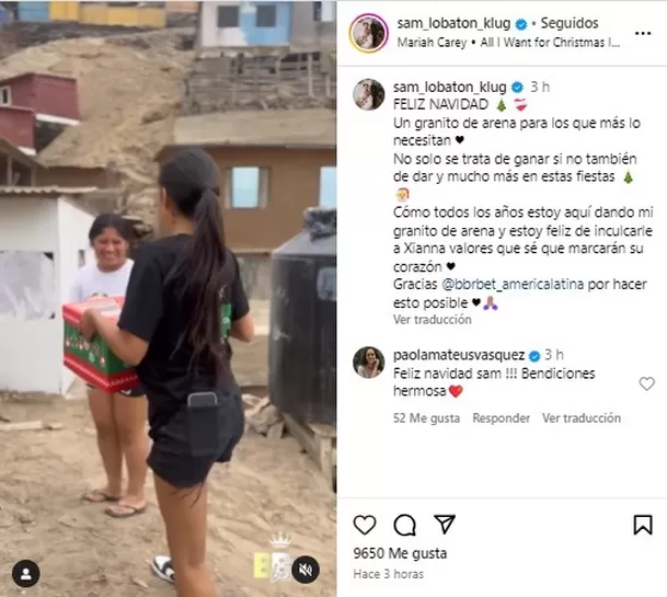 "FELIZ NAVIDAD. Un granito de arena para los que más lo necesitan. No solo se trata de ganar si no también de dar y mucho más en estas fiestas. Como todos los años estoy aquí dando mi granito de arena y estoy feliz de inculcarle a Xianna valores que sé que marcarán su corazón", escribió Samahara en su publicación.