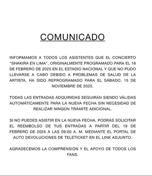 Como se sabe, la primera presentación de Shakira fue suspendida debido a problemas de salud de la cantante, razón por la que el show se reprogramó para el 15 de noviembre del 2025.