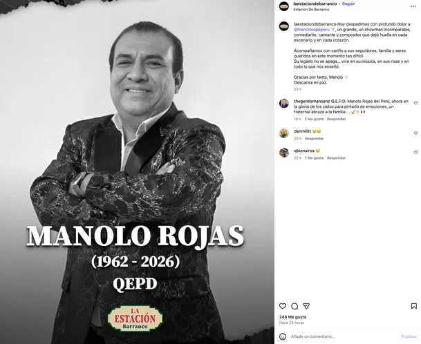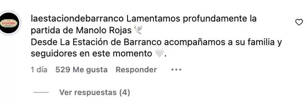 "Lamentamos profundamente la partida de Manolo Rojas 🕊️ Desde La Estación de Barranco acompañamos a su familia y seguidores en este momento 🤍", expresaron en la red social.