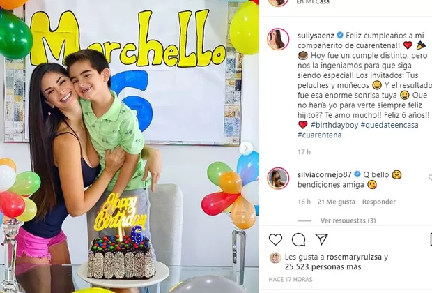 “Feliz cumpleaños a mi compañerito de cuarentena. Hoy fue un cumple distinto, pero nos las ingeniamos para que siga siendo especial. Los invitados: Tus peluches y muñecos y el resultado fue esa enorme sonrisa tuya. ¿Qué no haría yo para verte siempre feliz hijito? ¡Te amo mucho! ¡Feliz 6 años!”, escribió Sully junto a una foto al lado de un sonriente Marchello.