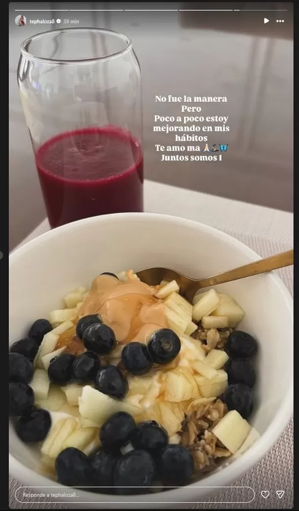 En una historia reciente, Tepha Loza compartió una imagen de un desayuno saludable, acompañada de un mensaje que sugiere un proceso de cambio en sus hábitos.