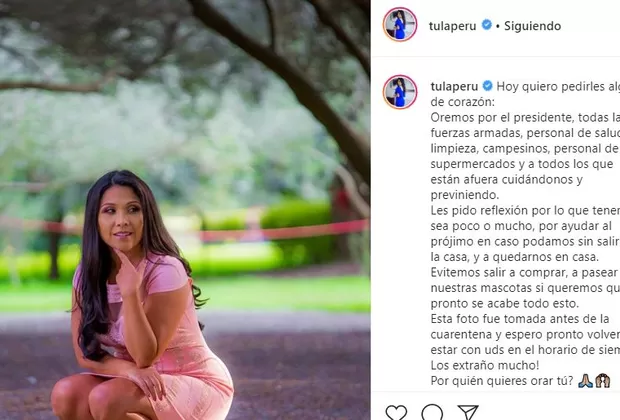 “Hoy quiero pedirles algo de corazón: Oremos por el presidente, todas las fuerzas armadas, personal de salud, de limpieza, campesinos, personal de supermercados y a todos los que están afuera cuidándonos y previniendo. Les pido reflexión por lo que tenemos sea poco o mucho, por ayudar al prójimo en caso podamos sin salir de la casa, y a quedarnos en casa. Evitemos salir a comprar, a pasear a nuestras mascotas si queremos que pronto se acabe todo esto”, se lee en la cuenta de Instagram de Tula.