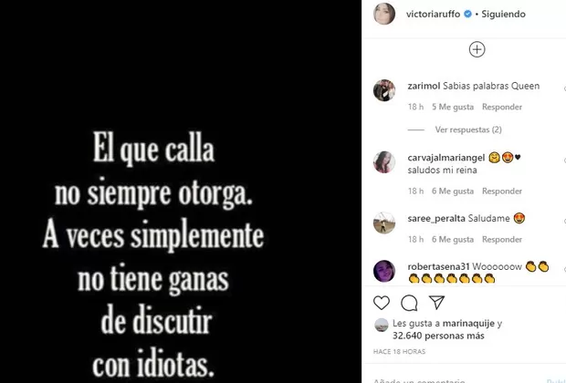 "El que calla no siempre otorga. A veces simplemente no tienes ganas de discutir con idiotas", se lee en la cuenta de Instagram de Victoria. De hecho, muchos usuarios han señalado que es un mensaje para Eugenio.