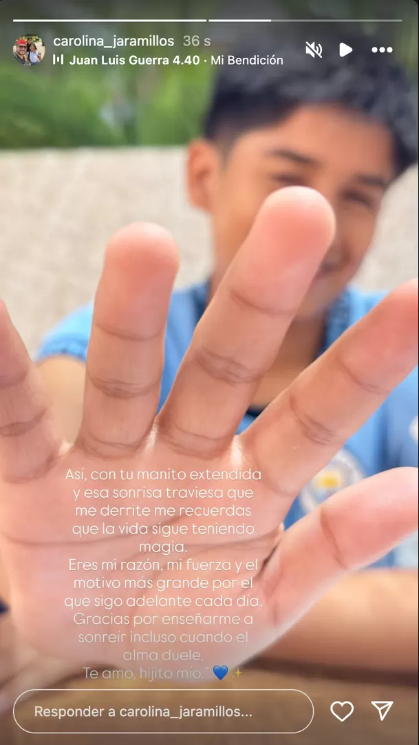 "Así, con tu manito extendida y esa sonrisa traviesa que me derrite me recuerdas que la vida sigue teniendo magia. Eres mi razón, mi fuerza y el motivo más grande por el que sigo adelante cada día", expresó Carolina Jaramillo.