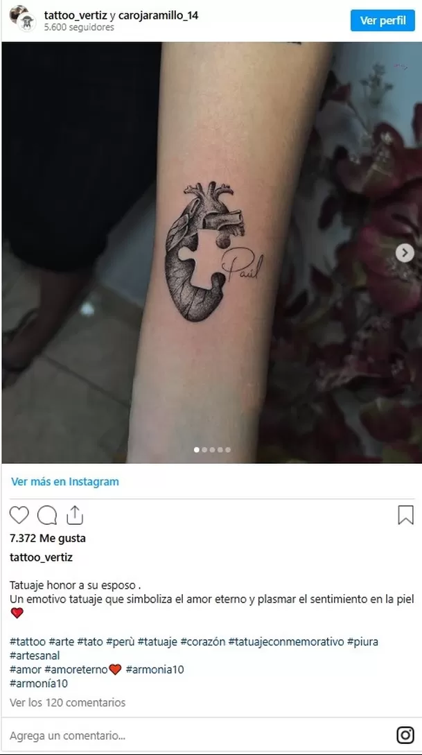 La esposa de Paul Flores se tatuó la firma del artista y un corazón con una pieza faltante, en cuyo espacio aparece el nombre del intérprete.