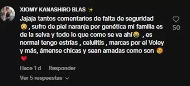 “Jajaja tantos comentarios de falta de seguridad , sufro de piel naranja por genética. Mi familia es de la selva y todo lo que como se va ahí. Es normal, tengo estrías, celulitis , marcas por el voley y más, ámense chicas y sean amadas como son”, escribió Kanashiro.