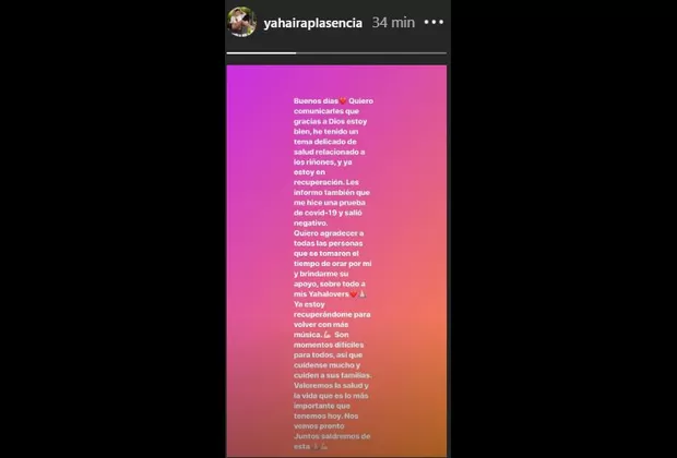 “Quiero comunicarles que gracias a Dios estoy bien, he tenido un tema delicado de salud relacionado a los riñones y ya estoy en recuperación. Les informo también que me hice una prueba de COVID-19 y salió negativo”, escribió Yahaira en sus historias de Instagram.