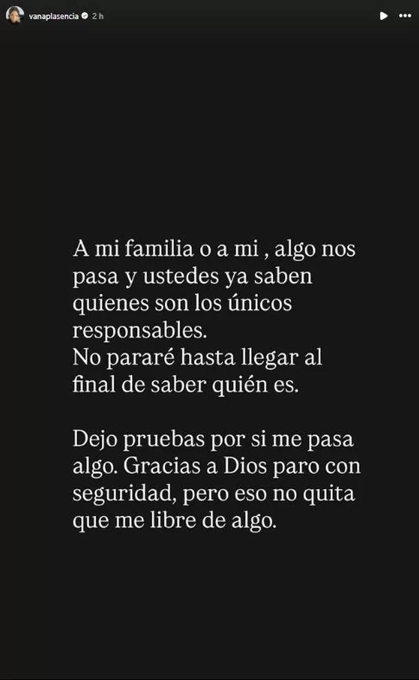 “A mi familia o a mí, algo nos pasa y ustedes ya saben quiénes son los únicos responsables. No pararé hasta llegar al final de saber quién es. Dejo pruebas por si me pasa algo. Gracias a Dios paro con seguridad, pero eso no quita que me libre de algo”, dice su comunicado.