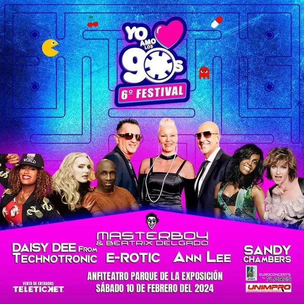 Tras el gran éxito obtenido en su pasada edición, se anunció la realización del 6° Festival “Yo amo los 90s”, el próximo sábado 10 de febrero del 2024 en el Anfiteatro del Parque de la Exposición, el cual tendrá a los máximos exponentes de la música de esa década.