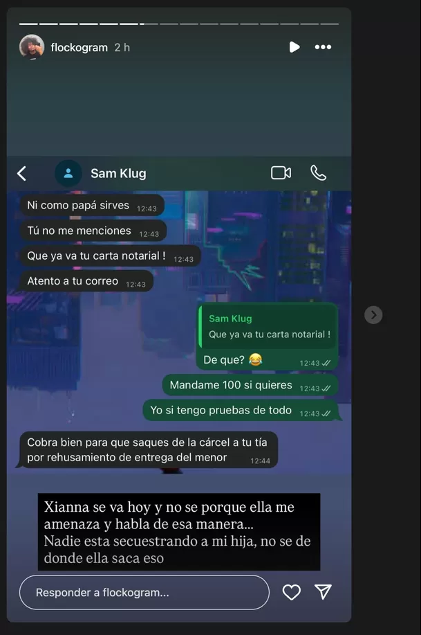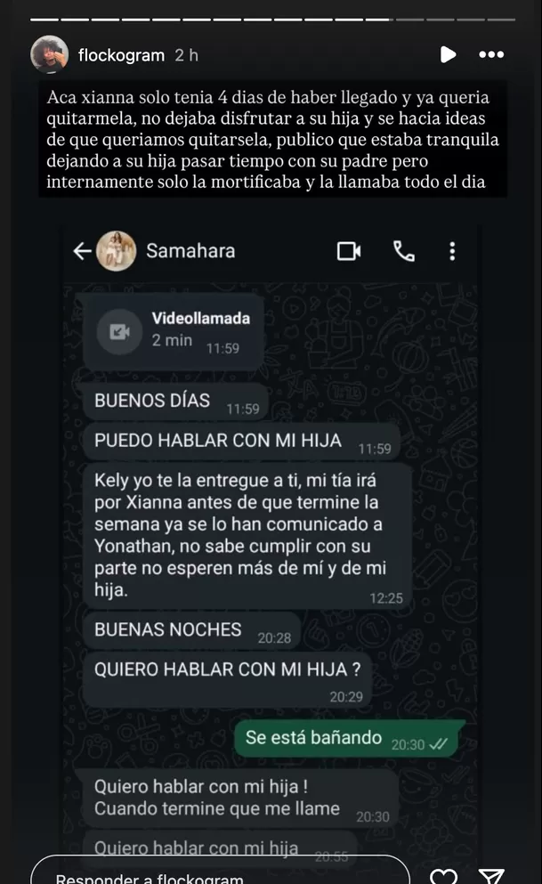Youna compartió conversaciones en las que se evidencian presuntas amenazas e insultos de parte de Samahara hacia él. Además, señaló un supuesto maltrato hacia la hija que ambos tienen en común, quien pasó varias semanas a su cuidado en Estados Unidos, donde actualmente reside.