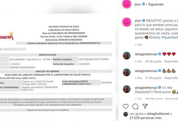 Acompañando la imagen el cantante escribe: "Negativo, gracias, Dios. Para los que estaban preocupados por mi estado de salud. Seguimos quedándonos en casita. Cuídese mi gente".