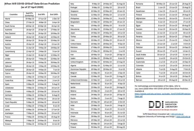 La Universidad de Tecnología y Diseño de Singapur y Data-Driven Innovation Lab publicaron un estudio en el que estiman posibles fechas de culminación de la cuarentena por el coronavirus (COVID-19), con un 97 %, 99 % y 100 % de probabilidad, para países del mundo. La estimación matemática proyecta que Perú superará la pandemia a fines de julio del 2020.