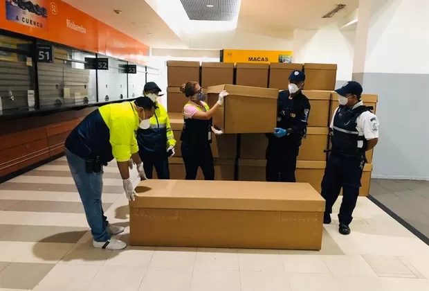 Ataúdes de cartón son almacenados en la terminal terrestre de Guayaquil. El Municipio ha donado 1500 cajones de cartón compactado para paliar la escasez de ataúdes. Foto: EFE/ Alcaldía de Guayaquil