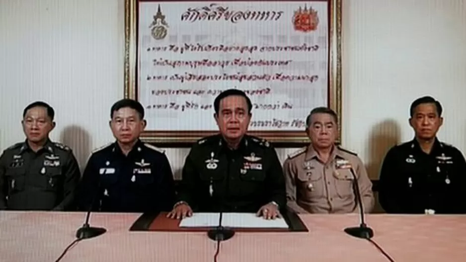 Rodeados por otros responsables militares, Prayuth anunció el golpe de Estado después de que en la segunda reunión entre representantes del Gobierno, la oposición y líderes de los manifestantes en el Club del Ejército no se alcanzase acuerdo alguno.