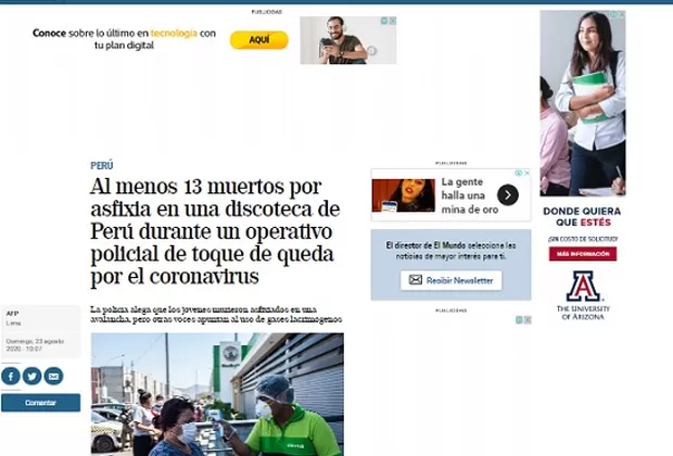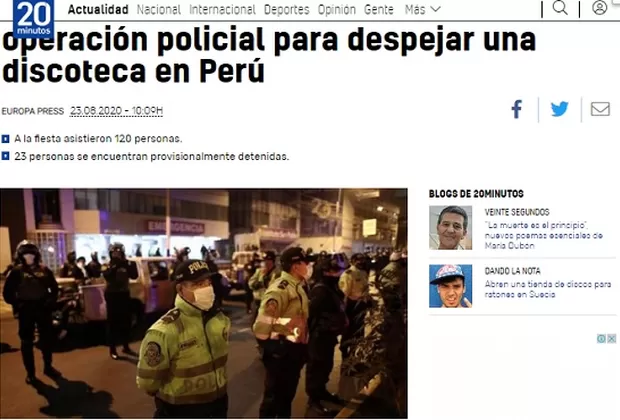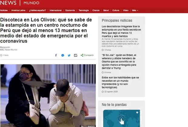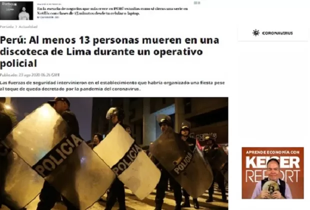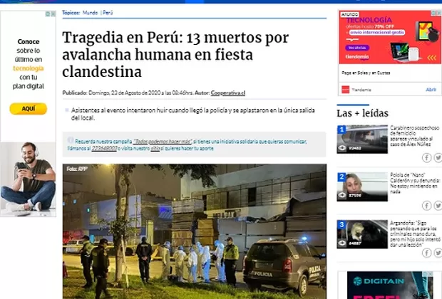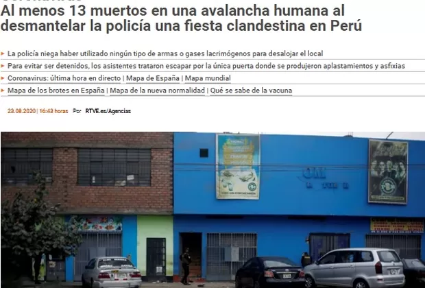 La policía allanó la discoteca donde 120 personas participaban en una fiesta convocada a través de las redes sociales, violando la norma que prohíbe reuniones grupales en Perú debido al estado de emergencia sanitario por el covid-19. "Frente a la intervención policial, que no empleó ningún tipo de arma o bomba lacrimógena, los asistentes a la fiesta intentaron escapar por la única puerta de ingreso, atropellándose y quedando atrapadas entre la puerta y una escalera del local", señaló el Ministerio del Interior en un comunicado.