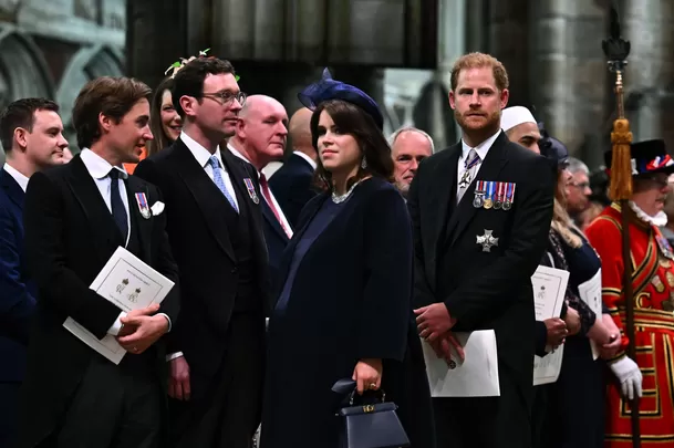El Duque de Sussex caminó solo por el pasillo del lugar para ubicarse en tercera fila antes de la llegada de su padre y Camila. Harry estuvo acompañado de su tío, el príncipe Andrés, su prima Beatrice de York y Edo Mapelli, esposo de la misma. Antes de la ceremonia, el esposo de Meghan Markle se lució muy amistoso.
