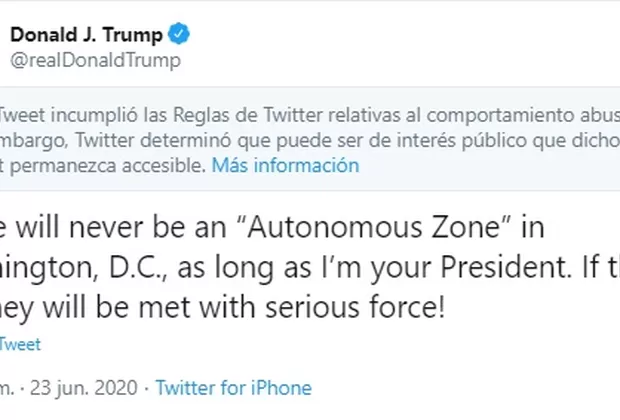 En el tuit ocultado por Twitter Trump advirtió que impedirá con rigor la creación de una "zona autónoma" libre de policías en Washington como la que se creó en Seattle. El mandatario también amenazó con severas penas de prisión a los que dañen monumentos nacionales y dijo que quienes lo hagan "se enfrentarán con una gran fuerza".