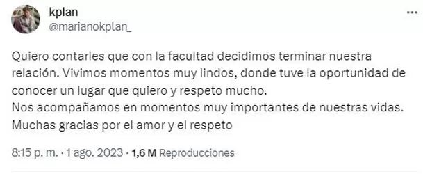 “Quiero contarles que con la facultad decidimos terminar nuestra relación. Vivimos momentos muy lindos, donde tuve la oportunidad de conocer un lugar que quiero y respeto mucho. Nos acompañamos en momentos muy importantes de nuestras vidas. Muchas gracias por el amor y el respeto”, posteó Mariano en Twitter al mismo estilo de Tini y Rodrigo.