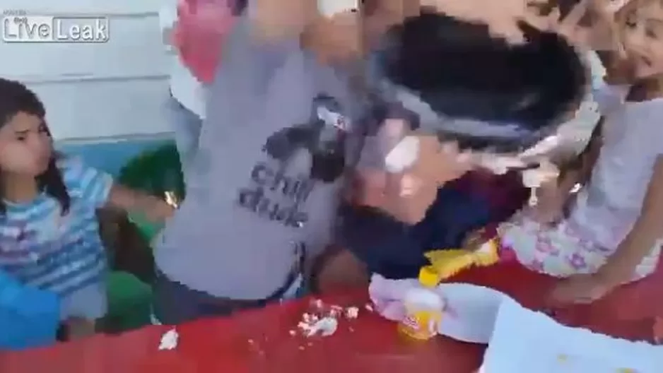 El cumpleañero no se sintió nada bien cuando uno de sus invitados empujó su cara toscamente contra su torta y le manchó todo el rostro de chantilly. Además, se cayó de rodillas al piso.