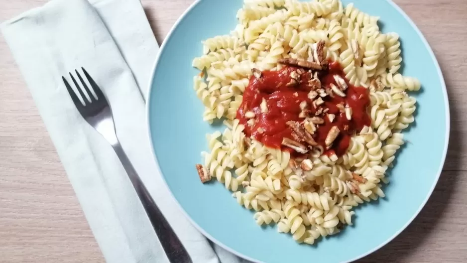 Mientras se sancochan los fideos, poner en una olla o sartén a cocer cebolla, ajos, tomate, albahaca (todo picado), orégano, sal y pimienta. Esperar a que enfríe, y agregar el ingrediente secreto: una palta madura más una pizca de panela. Licuar, verter sobre los fideos largos o cortos y ¡listo el almuerzo saludable! Puedes agregarle champiñones si te provoca.