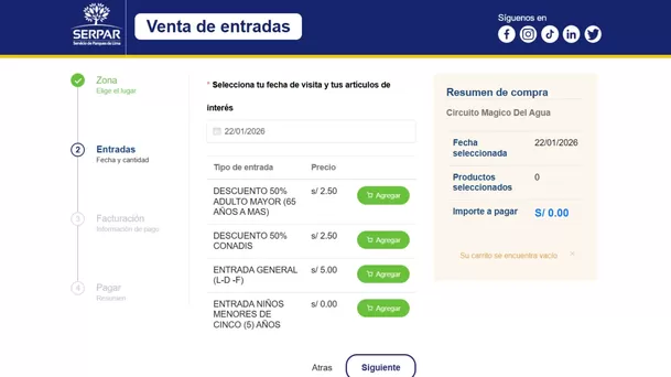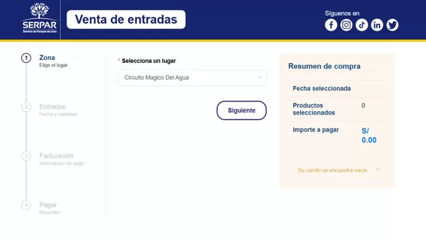 Puedes comprar tus entradas en las boleterías del lugar; sin embargo, si deseas evitar colas, lo más conveniente es la modalidad virtual, lo cual se puede realizar a través de la plataforma de Serpar. Sigue estos pasos: