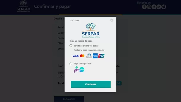 5. Finalmente, deberás elegir un método de pago, el cual puede ser tarjeta de crédito, débito, Yape o Plin. Las entradas llegarán a tu correo electrónico o podrás descargarlo.